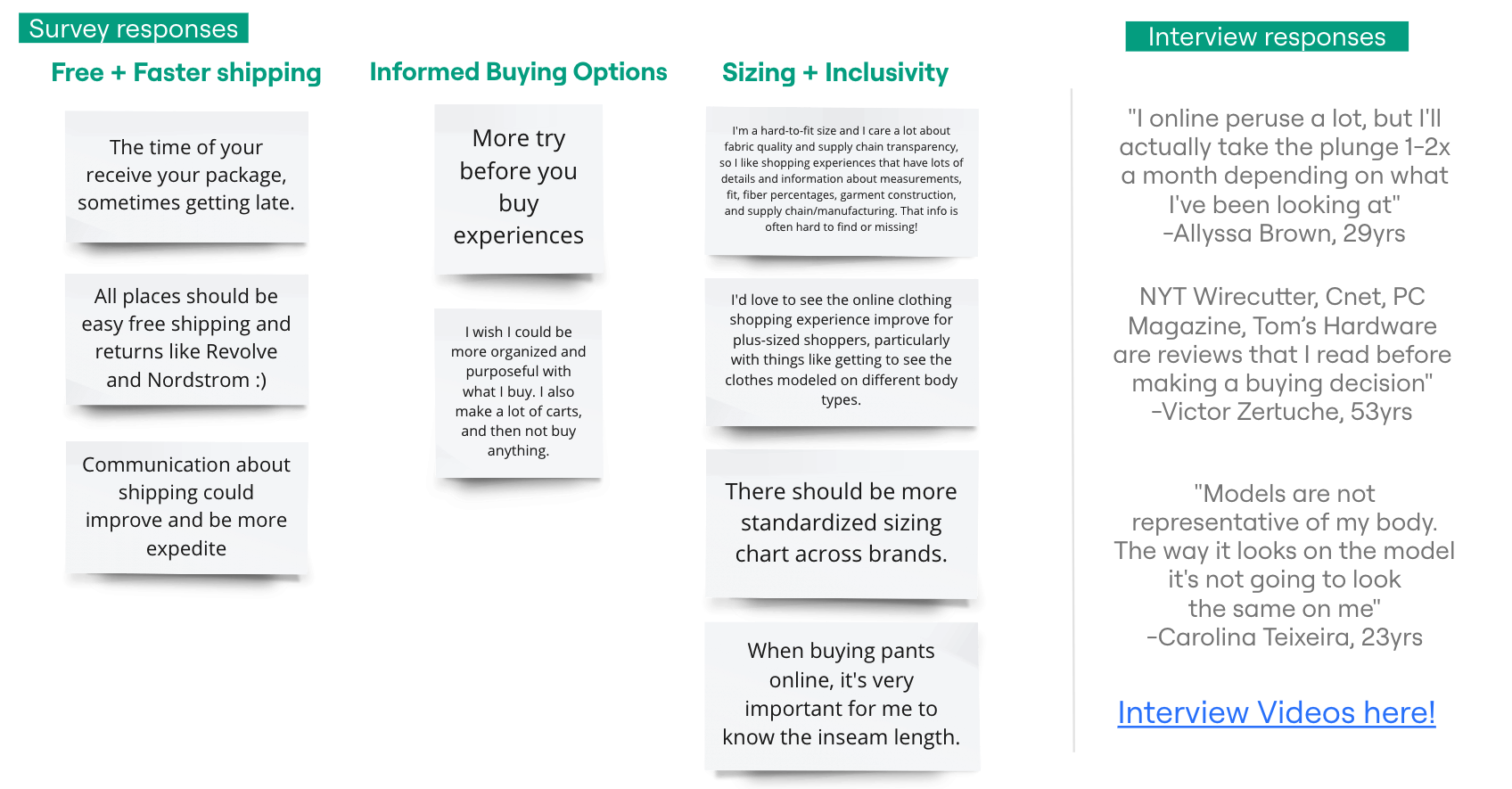 I used affinity diagramming for both the survey and interviews and was interested to see the similarities and differences between both methods of research.